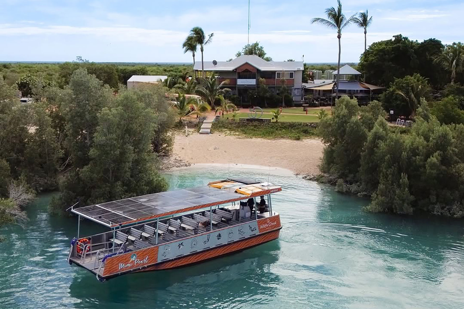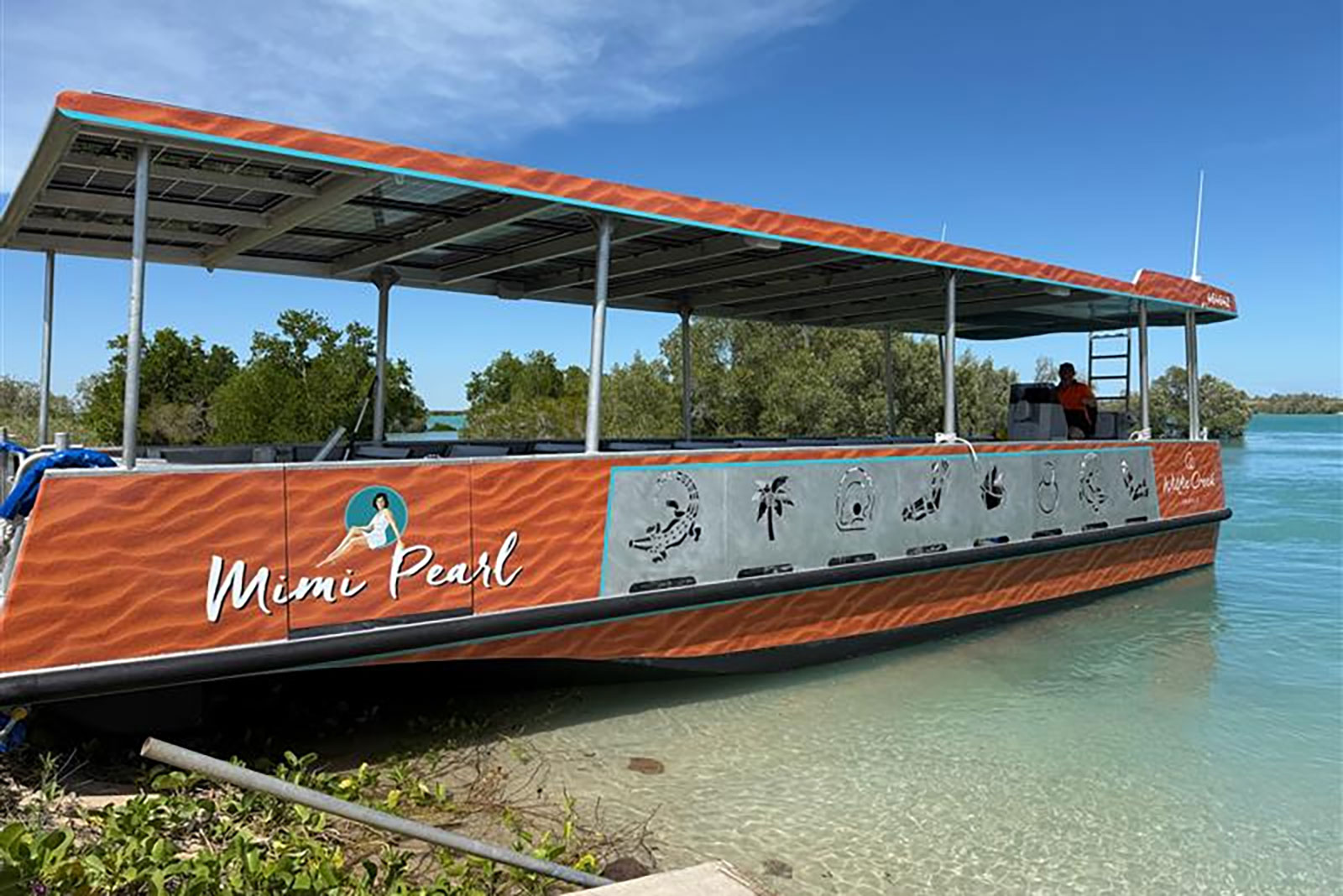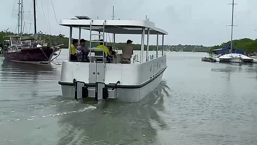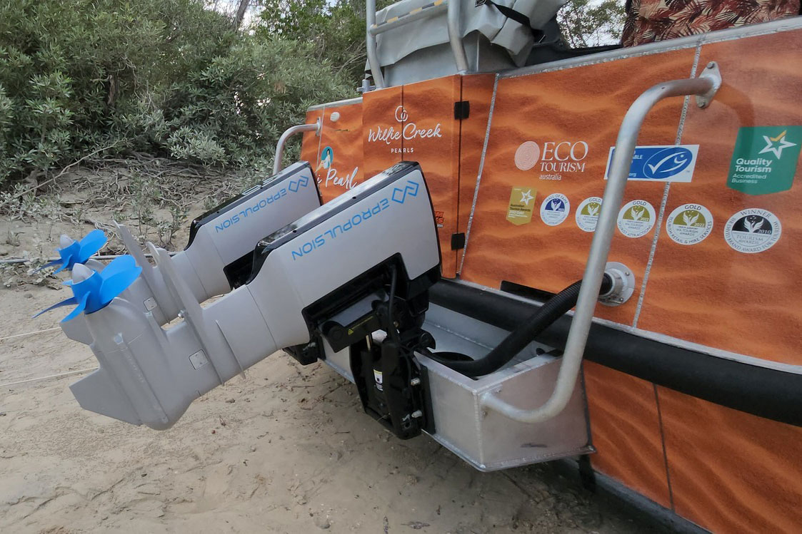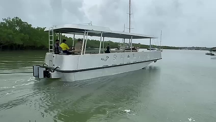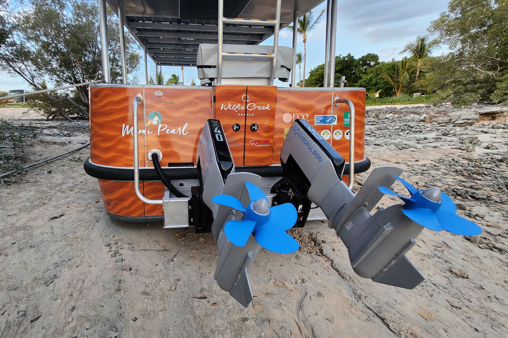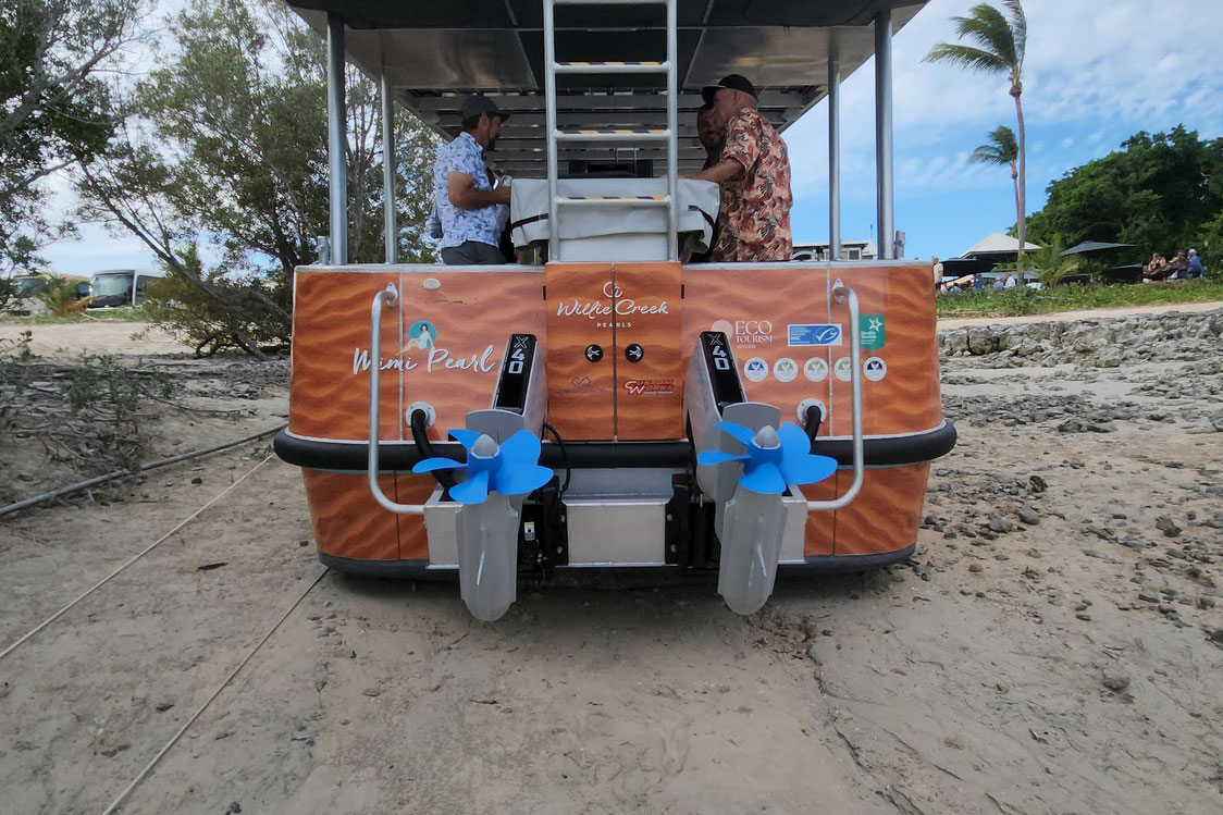 This 2025 Mimi Pearl is an electric Motorboat from Custom Works, powered by a 80 kW ePropulsion motor and a 41 kWh battery pack, offering a quiet and eco-friendly boating experience.