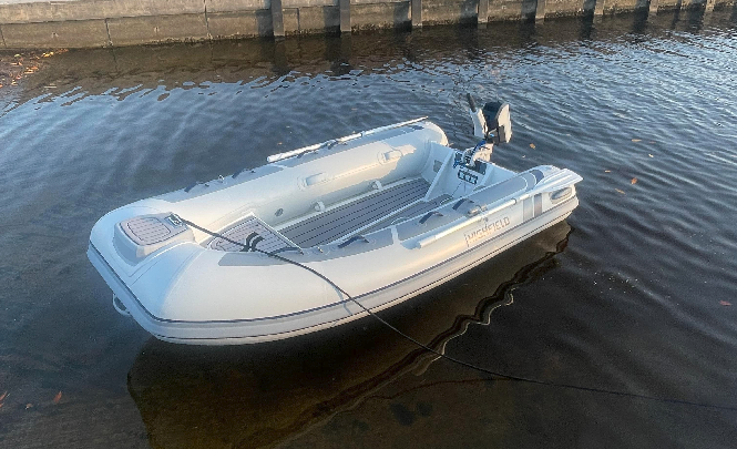This 2025 CL310 is an electric RIB from Highfield, powered by a 2 kW ePropulsion motor and a 1,539 Wh battery pack, offering a quiet and eco-friendly boating experience.
