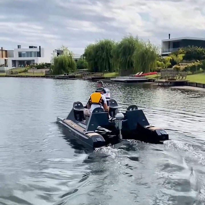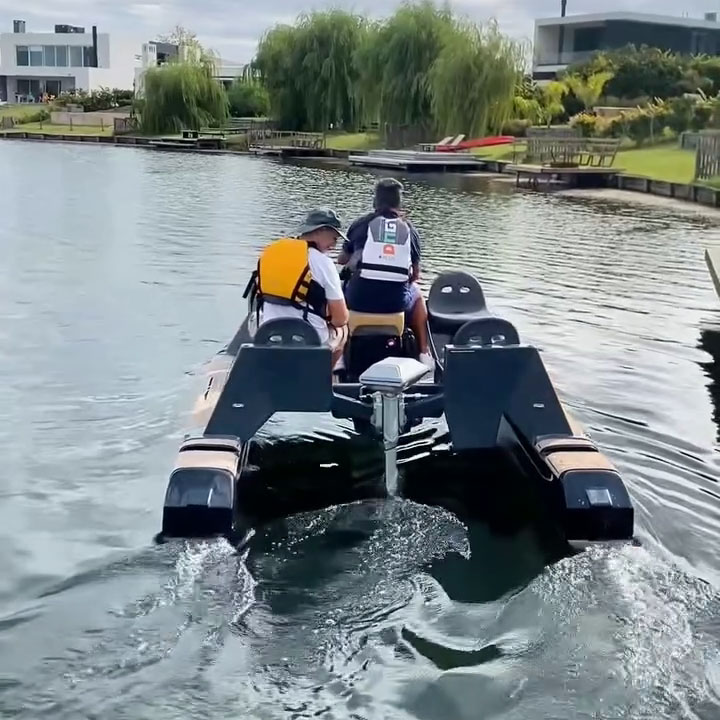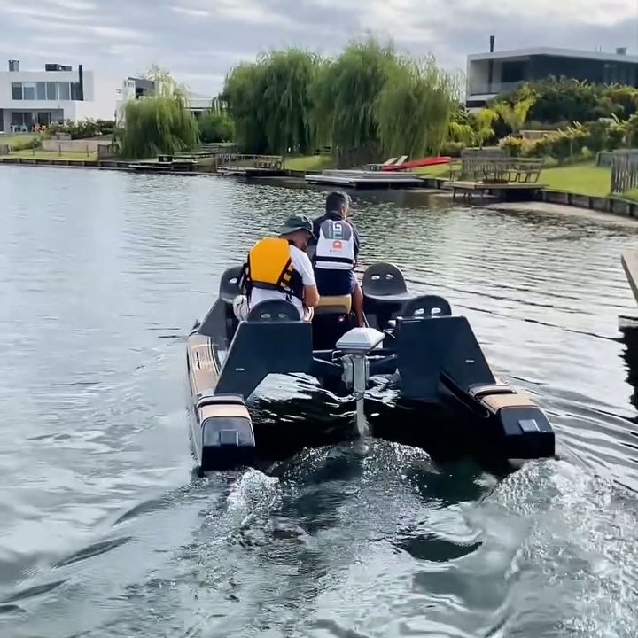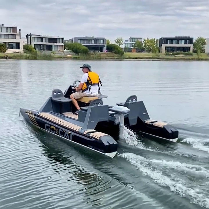 This 2026 Go Cat is an electric Catamaran from Naval Electric, powered by a 3 kW ePropulsion motor and a 3 kWh battery pack, offering a quiet and eco-friendly boating experience.